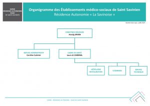 La direction des établissements médico-sociaux de Saint-Savinien est assurée par un directeur d’établissement sanitaire, social et médico-social secondé par un cadre de santé et un infirmier coordinateur.